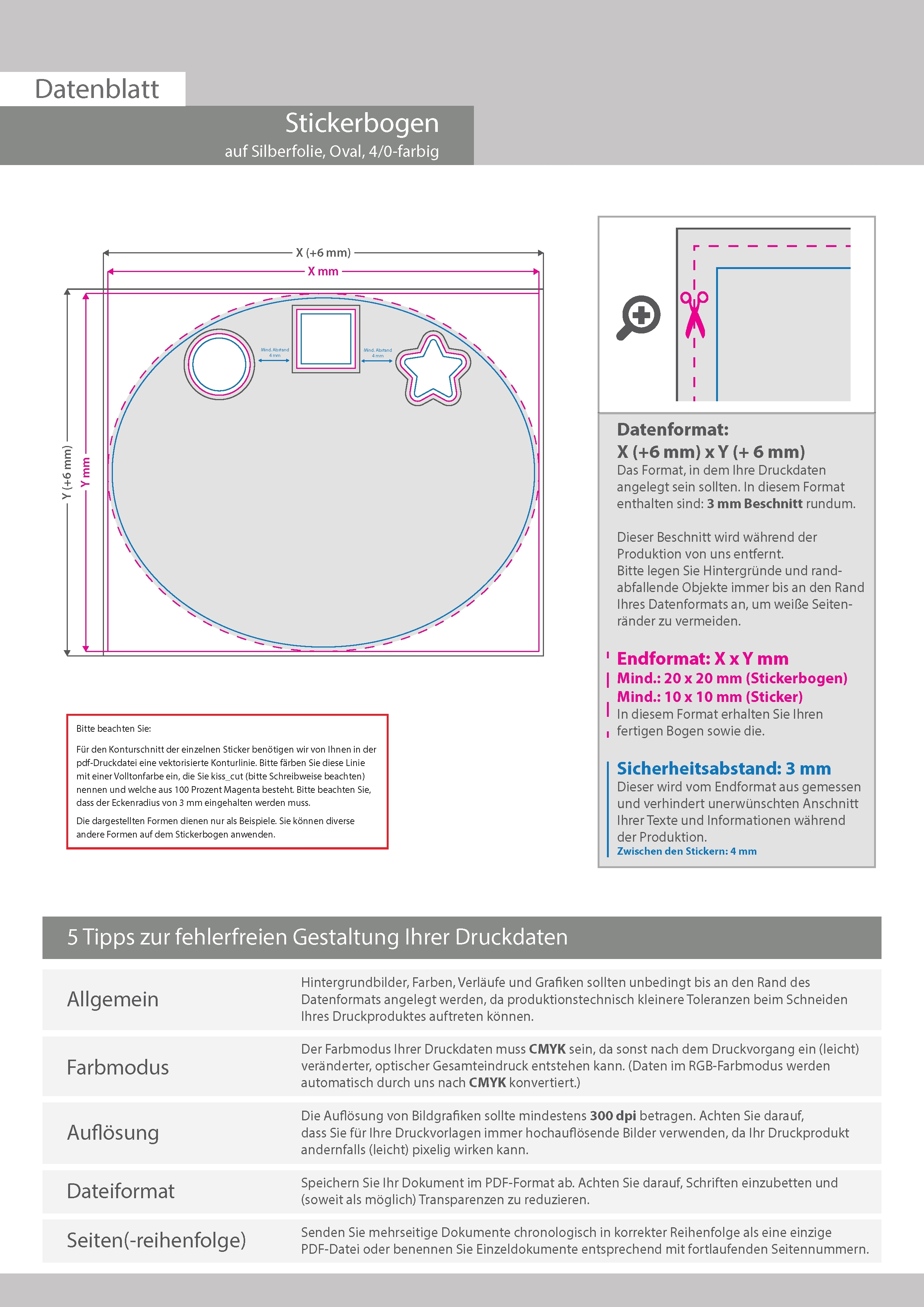Stickerbogen auf Silberfolie 4/0 farbig bedruckt oval (oval konturgeschnitten)