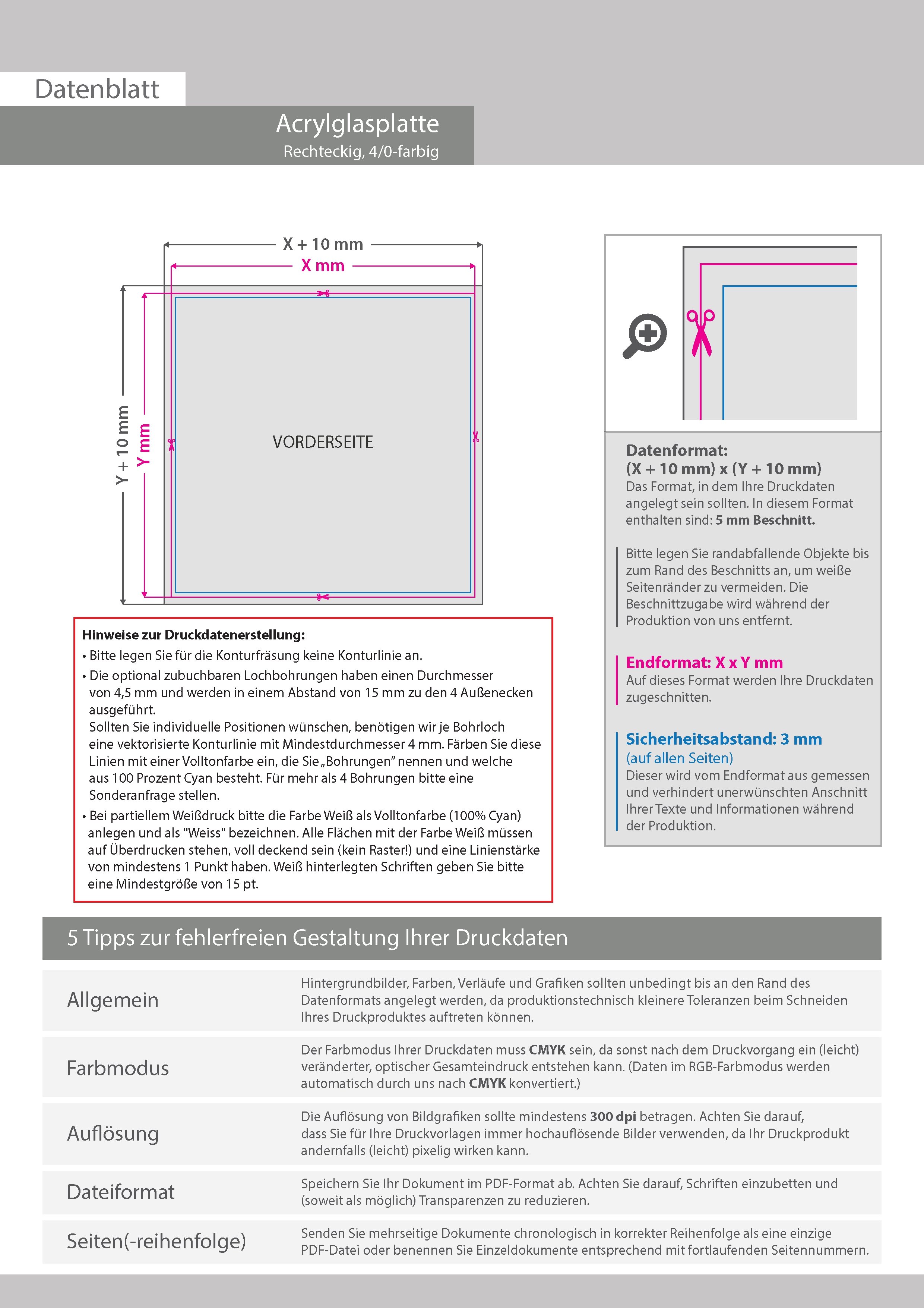 Acrylglasplatte mit freier Größe (rechteckig) im Kleinformat ab 1 x 1 cm einseitig 4/0-farbig bedruckt
